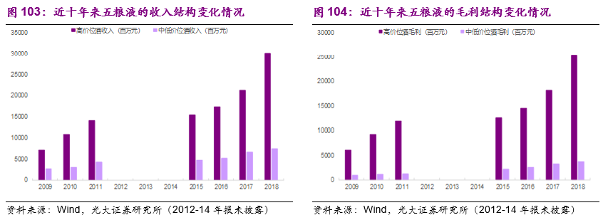 虽然以五粮液酒为代表的高价位带白酒无论是在销售收入还是毛利的占比都处于绝对领先地位,但是和茅台相比,五粮液的低端白酒收入和毛利占比仍是略高的。2018年公司高价位带白酒实现销售收入301.89亿元,占酒类业务收入的比重为80%;高价位带白酒实现销售毛利254.52亿元,占酒类业务毛利的比重为86.9%。20世纪90时代中期,五粮液通过品牌买断模式实现了收入和利润的快速扩张,系列酒成为重要的增长驱动因素;2009年以来高价位带白酒的收入占比不断提升,从2009年的72%提高到2018年的80%。