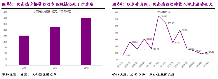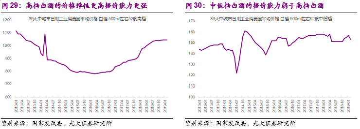 次高端具备提价能力,但是提价幅度及公司的受益程度弱于高端品牌:由于次高端品牌在一定区域或者消费场合内同样扮演着社交及面子消费功能,因此次高端价格带的白酒同样具备一定的提价能力。在2016-17年的白酒景气周期内,由于次高端价格带自身定位等特点,其市场规模快速扩容,在高端白酒价格带拉升的情况下,主流次高端品类剑南春、水井坊、洋河梦之蓝、汾酒青花系列等均进行了产品的提价。但是次高端价格带的竞争格局相对分散而且主流产品的经销商均面临盈利能力相对有限的问题,厂商提价之后通常以货补、费用支持等方式返回终端网点及经销商,因此次高端白酒提价对于厂商的受益程度同样弱于高端白酒。