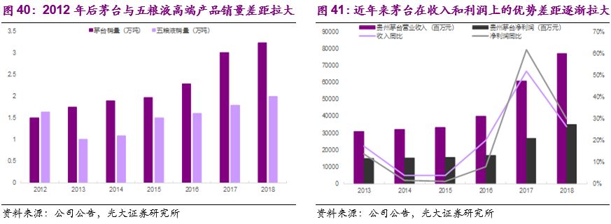 3)21世纪初至今:茅台时代。2005年茅台净利润超过五粮液,2008年飞天茅台的出厂价超过五粮液,2013年茅台在收入规模及高端产品的销量上超过五粮液,茅台时代正式到来。2018年茅台实现销售收入772亿,同比增长26%;实现净利润352亿,同比增长30%,和五粮液的优势差距仍在逐渐扩大。
