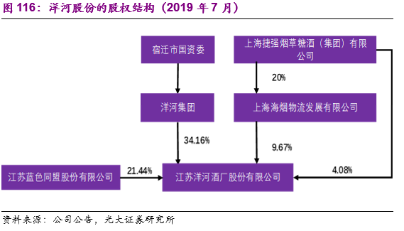 股权结构:2002年洋河就行了改制重组,洋河集团作为主要发起人联合 6 家法人和 14 位管理层成员共同发起设立了江苏洋河酒厂股份有限公司。2006年公司增资扩股,包括中层以上管理人员及业务、技术骨干在内的经营管理人员共同出资设立了蓝天贸易、蓝海贸易,通过认购新增股份实现了持股,2017年江苏蓝色同盟股份有限公司吸收合并了蓝天贸易和蓝海贸易。截止到目前洋河股份的实际控制人为宿迁市国资委,宿迁市国资委通过洋河集团持有上市公司占比34.16%的股权,蓝色同盟持有占比21.44%的股权,战略投资者上海海烟、上海捷强等仍有持股。