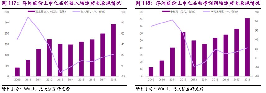 历史业绩回顾:洋河登陆资本市场相对较晚,于2009年才正式上市。2009-2018年公司的营业总收入从40.0亿增长到241.6亿,年均复合增速为22.1%;2009-2018年公司的净利润从12.5亿增长到81.2亿,年均复合增速达为23.1%。相较于大部分白酒上市公司受行业景气度影响、收入和利润增速波动明显不同,洋河的历史收入和利润表现出较强的穿越周期的能力,即使在行业深度调整的2013-14年,公司的收入增速也仅同比下降13%和2.34%,稳健增长能力仅次于茅台。