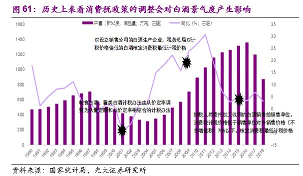 历史上看,消费税政策的调整会对白酒行业景气度产生影响。白酒消费税的征收方式不断完善同时也不断趋严,回顾白酒行业的景气周期波动,消费税政策的重大调整会对行业景气度产生较大的影响。最有代表性的是1998-2003年第二次行业调整期间,2001年白酒消费税新政将白酒的计税办法由从价定率调整为从量定额和从价定率相结合,加大了白酒行业的消费税负担,在一定程度上加速了行业的调整。