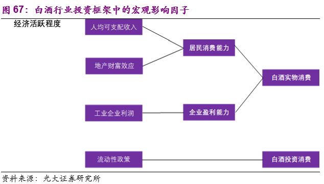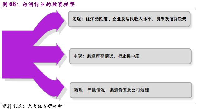 2)从各个层面的驱动因子出发,希望能够搭建出白酒行业的投资框架,对于不同阶段白酒的投资机会进行前瞻性判断。宏观:经济活跃度、企业及居民的收入水平、货币及信贷政策等;中观:渠道库存情况、行业集中度等;微观:产能情况、渠道价差及公司治理等。