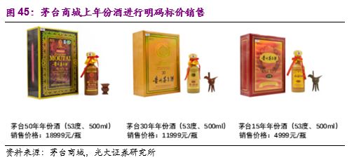 茅台最早推出年份酒制度,老酒收藏价值建立最为完善:虽然年份酒和老酒的概念不尽相同,年份酒是指在基酒中添加了一定比例的特定年份老酒,而老酒是指酿造出来后经过数年正常存放的成品酒。但是无论是年份酒的推出还是老酒价格系统的搭建,茅台均走在行业前列,都进一步激发了茅台酒的收藏价值和茅台的品牌价值。1)年份酒:茅台是我国较早推出“年份酒”制度的公司,1997首次包装30年、50年老酒,1998年首次包装80年老酒,1999年首次包装15年老酒,目前15年、30年、50年、80年四种年份酒一直在保持生产。以茅台商城上的销售价格为例,目前15年、30年、50年的销售价格分别为4999/11999/18999元/瓶。