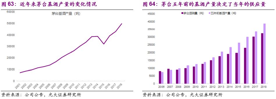 生产工艺决定了茅台每年供应量相对可以跟踪:按照茅台的生产工艺,根据五年前的茅台酒产量,再扣减由于损耗带来的一定比例的非商品率,就可以估算出当年茅台酒可能的供应量。在推算过程中可能会有边际影响的是茅台的老酒库存量(在勾兑过程中加入一定比例以前年份盘勾贮存的半成品酒俗称老酒,其贮存期一般在五年以上,根据茅台工艺的要求每年都会存留一定量酒用于以后年份的勾兑),原则上来说当茅台的供应较为紧张的情况下,可以通过老酒的库存进行调节。