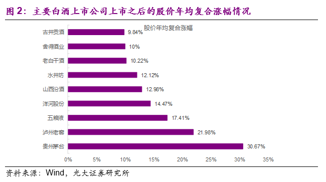 从个股的角度,暂不考虑最近5年上市的次新股,贵州茅台上市之后的股价年均复合涨幅达到30%以上,泸州老窖和五粮液也分别达到21.96%和17.41%,股价年均复合涨幅位列白酒行业的前三位。同时大部分白酒上市公司在上市之后的年均复合涨幅均在10%左右,考虑到白酒公司的上市时间均在20年左右,能达到10%以上的股价年均复合增幅,长周期整体的投资回报已经相当可观。