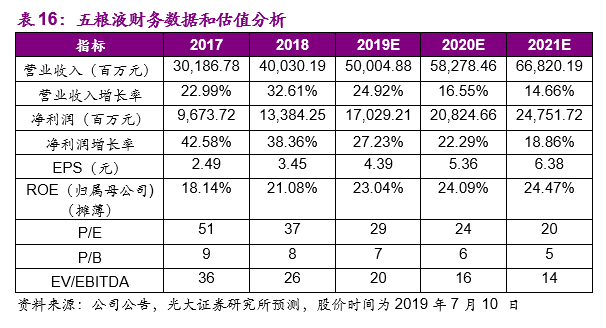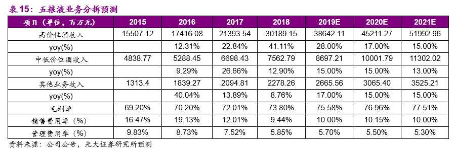 (4)毛利率和费用率,考虑到五粮液出厂均价的提升,我们预测公司2019/2020/2021年综合毛利率分别为75.58%/76.96%/77.51%;费用率方面,在控盘分利渠道变革的背景下,公司销售人员的数量仍处于提升阶段,整体销售费用率相对平稳,我们预测公司2019/2020/2021年销售费用率分别为10.00%/10.15%/10.00%;我们预测公司2019/2020/2021年管理费用率分别为5.70%/5.50%/5.30%。