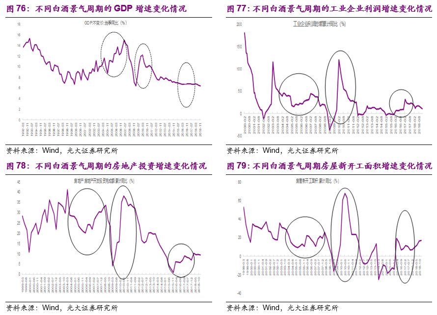 经济活跃程度影响白酒实物消费、宽松货币政策刺激白酒金融消费:综上所述,在2004-2007年、2009-2011年和2016-17年这三个历史阶段,白酒行业的基本面环比改善、白酒指数取得了相对明显的超额收益。虽然这三个历史阶段均有特定的历史背景,但是共性同样明显:通过信贷或者货币政策的宽松,投资增速回升、经济增速阶段性改善,同时企业部门的利润增速改善、居民的可支配收入增速也有提高。同时,在流动性宽裕的背景下,高端白酒特有的保值能力也进一步刺激了白酒的投资需求。