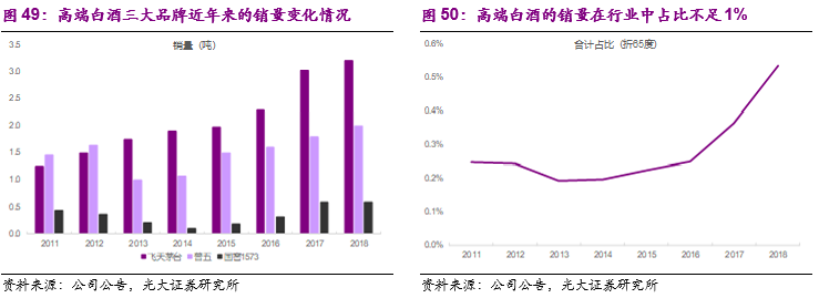 1)高端白酒:格局清晰且集中度高,销量占比仍在提升通道。在白酒各大价格带中,高端白酒的竞争格局最清晰且集中度最高,三大品牌茅台、五粮液及国窖1573手握高端白酒的三张入场券,其余品牌虽有战略性高端产品布局(如水井坊菁翠、洋河梦9及手工班、郎酒青花郎、酒鬼内参等),但绝对体量很小。2011-18年三大品牌的销量合计从3.2万吨提高到5.8万吨,年均复合增速超9%,如果从2015年行业调整期结束开始计算,2015-18年的销量年均复合增速达到16.5%。不仅增长明显,高端白酒的销量行业占比(折65度)持续扩大,并超过0.5%。