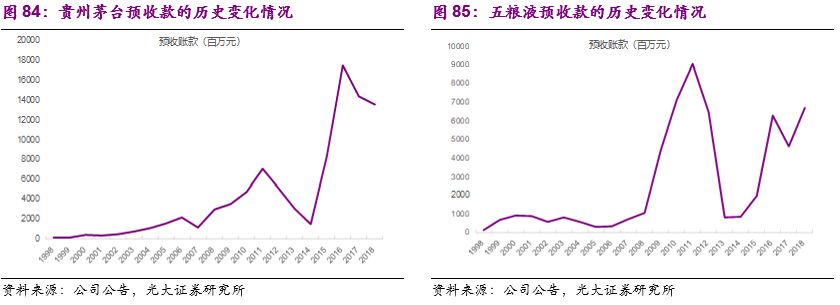 预收账款:白酒厂商的预收账款主要是因为:1)对经销商的发货采用先款后货的模式,由于发货和打款时间的错配造成预收账款的确认;2)大部分白酒厂商采用产销分离的模式,由专门的销售子公司进行产品的销售,由于生产部门和销售部门的产销时间错配同样会造成预收账款的确认。其中第一种情况是白酒预收账款产生的主要原因,也可以作为经销商打款积极性的重要观测指标。在行业调整初期,渠道库存压力提升之后经销商的打款积极性下降,白酒企业的预收款变化也会有较为明显的影响。2012年白酒行业第三轮调整期开始,贵州茅台和五粮液的预收款峰值均出现在了2011年,2012-2014年出现大幅下降、此后在2015年企稳。但是值得一提的是,2018年开始,茅台开始严格按照按月打款的模式,预收款作为行业景气度前瞻指标的意义相对有所弱化。