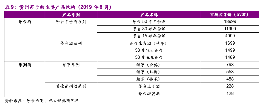 产品结构:贵州茅台的产品结构主要由茅台酒和系列酒两大类构成,分别由贵州茅台酒销售有限公司和贵州酱香酒营销有限公司两个销售子公司进行销售。1)茅台酒:主力产品是53度飞天茅台,除此之外还有茅台年份酒、茅台生肖酒、精品茅台等。2)系列酒:包括赖茅、汉酱、茅台王子酒和茅台迎宾酒等品牌。