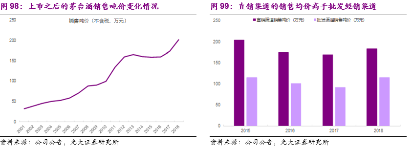 2)价:直接提价能力行业最强,产品结构+渠道结构优化推动均价间接提升。根据公司的年报,2001-2018年茅台酒的销售吨价从32万元提高到近202万元。1)直接提价:正如我们的白酒行业供需模型中所述,无论是社交消费还是礼品消费,消费者会更倾向为高定价的高端白酒产品买单,而满足在消费过程中的潜在更高层次、除温饱之外的需求。作为品牌力最强的白酒品牌,从2001年开始飞天茅台的出厂价从178元一路上涨到969元,年均复合增速达到11.2%,长周期来看茅台的出厂价提升幅度有持续跑赢通胀的能力。2)间接提价:除了直接提价之外,茅台还可以通过产品结构和渠道结构的优化实现均价的间接提高。一方面,茅台生肖酒、精品茅台及年份酒等更高端产品的出厂价均高于普通飞天茅台;另一方面,2019年开始公司开始渠道体系的破局之年,2018年取缔的违规经销商的配额将会通过直营渠道释放,按照公司年报披露的数据,直营渠道的销售吨价显著高于批发经销渠道。