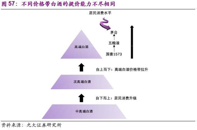 相较于其他白酒,高端白酒的社交和礼品属性更强,和经济活动的活跃程度关联性更强,我们认为随着经济的发展及高端白酒存储价值的逐步开发,高端白酒的销量占比仍会处于提升通道。但是正如前文所述,品牌力的积淀绝非一蹴而就,每次行业调整期总会有品牌脱离高端白酒阵营,在景气周期想要再获高端白酒的入场券仍相对困难。在高端白酒在整个行业销量比重提升的背景下,茅台、五粮液及国窖1573三大品牌有机会充分受益于价格带需求的扩容,增长最为确定。