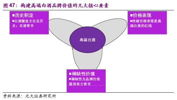 综上所述,白酒品牌力的构造既需要历史的积淀也需要常年的维护和经营。历史的积淀和当地的酿酒文化及历史传承有关,同时新中国成立之后的五次全国评酒会也进一步强化了名酒的品牌背书,在白酒市场化运作之后提供品牌积淀。然而从第一届评酒会的四大名酒到第二、三届的八大名酒以及后两届更多的获奖品牌,茅台能够脱颖而出成为白酒之王,汾酒和五粮液也曾经历过第一品牌的年代,这和其在品牌积淀基础上抓住市场机遇的品牌运作有密不可分的关系。通过复盘白酒王座的变更史,我们认为:1)价格是高端白酒的生命线:消费者愿意为白酒特别是高端白酒的特殊社交属性付出产品溢价。五粮液的崛起正是抓住了市场化运作之后名酒涨价的良机,而茅台的反超也是在行业调整期坚持价格红线不放松,给调整之后的崛起奠定基础。2)稀缺性能够为高端白酒的品牌价值提供有力背书:消费者买单高端白酒的价格溢价背后一定蕴含着其供给的稀缺性,同时稀缺性又能催生高端白酒的收藏价值,提升其内在品牌力价值。汾酒在白酒市场化初期积极扩产,产量位居行业第一的同时也丧失了稀缺性;五粮液通过买断经营模式快速扩张其收入和市场份额,五粮液主品牌的品牌力被逐渐稀释。