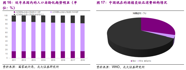 数据显示,从人口结构上来看,60岁及以上的人口占比已经从2011年的13.7%快速提高到2018年的17.9%,伴随着人口出生率的下降,未来人口老龄化的趋势预计仍会持续。同时根据WHO的数据,目前我国的酒精类饮品消费结构中,以白酒为代表的烈酒仍占比高达67.2%,啤酒和红酒的占比分别为29.6%和3.1%(按照烈酒40度、啤酒4度、红酒8度计入来计算纯酒精量,下同),白酒仍旧是国内酒精消费的最主要构成,未来有可能面临红酒等其他品类的替代。
