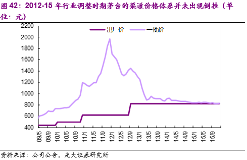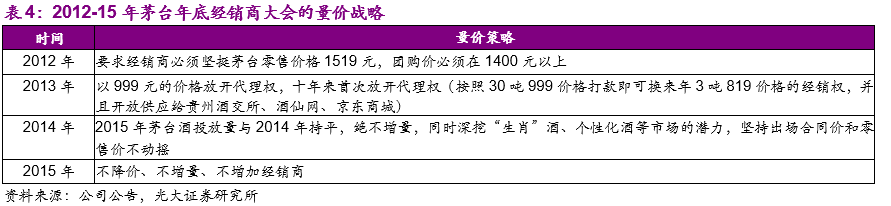 2012-15年在白酒调整期间,五粮液价格战略上的错误执行以及前期经营买断模式下子品牌对主品牌价格的稀释给了茅台实现反超的机会。针对限制三公消费对高端白酒行业需求的重大打击,茅台迅速做出调整:1)坚守价格底线:2012年经销商大会严格要求经销商必须坚挺茅台零售价格1519元,团购价必须在1400元以上;2)控量保价:2013年茅台以999元的价格放开了代理权,2014-15年均确定不增加投放量,提出“不增加销量、不增加新经销商、不降低出厂价格”的三大原则。