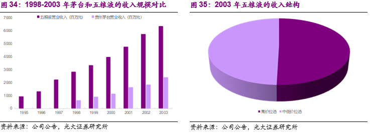 2)20世纪90年代中期-21世纪初:五粮液时代。如果说汾酒由于未能抓住市场经济时代名酒涨价的机遇而逐渐远离高端白酒阵营,那么五粮液便是充分受益于名酒涨价时代,并且在终端价格上实现对汾酒、茅台等其他名酒的反超。在20世纪90时代中期,五粮液开始执行品牌买断模式,即利用自身过剩的生产能力与品牌号召力,为其他品牌加工生产相关产品,同时以五粮液的品牌为质量提供背书。从第一个买断运营品牌“五粮醇”开始,公司相继与不同合作伙伴开发了“金六福”、“浏阳河”、“京酒”、“老作坊”等一系列买断品牌。从20世纪90年代到21世纪初五粮液迎来了快速发展阶段,收入规模从1995年的9.15亿快速增长到2003年的63.3亿,年均收入复合增速达到27%,在行业第二次调整期逆势增长,而2003年茅台的收入规模只有24亿元。2003年五粮液63.3亿的收入中,高价位酒和中低价位酒分别贡献31.9亿和31.2亿元,几乎分别占据了半壁江山。