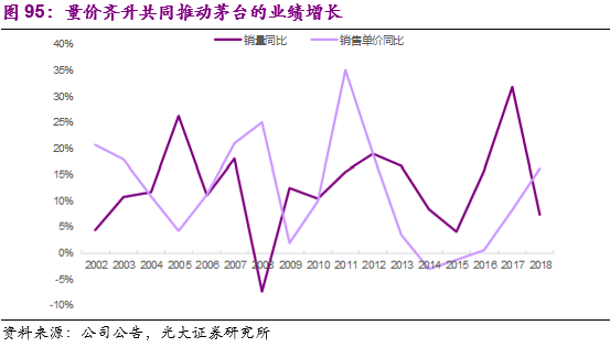 1)量:消费属性+金融属性兼具,长期渗透率提升空间明显。2001-2018年茅台酒的销量从4400吨增长到约3.25万吨,如果按照统计局公布的2018年白酒行业871.2万吨(折65度)的总产量计算,茅台的销量占比不足0.4%。以瓶数计算,3.25万吨的茅台酒销量大概对应不足7000万瓶的销量,假设中国14亿人口对应4.7亿户家庭(户均3人),那么茅台的家庭平均消费渗透率仍不足15%。茅台是白酒行业的第一品牌,除了商务宴请等正常消费属性之外的存储升值需求同样明显,进一步提升了白酒的长期量增空间。同时由于酱香酒生产工艺的限制,茅台酒每年的供应量相对有限,能够保证公司的需求长期稳健的增长。