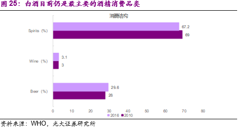 其他酒精饮品对白酒的替代作用同样不明显:对于白酒的替代品问题,数据显示以红酒和啤酒为代表的其他酒精类饮品对白酒的替代效用并不明显。2010年以白酒为代表的烈酒消费占比为69%,2016年虽然略有下降、但是仍达到67.2%,依然是目前酒精消费的最主要品类。2010-2016年啤酒的消费占比从28%小幅提高到29.6%,红酒的消费占比从3%小幅提高到3.1%。