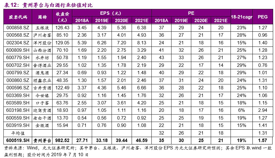 盈利预测与投资建议:我们预测贵州茅台2019/2020/2021年实现营业收入855.89/994.23/1151.23亿元,分别同比增长16.23%/16.16%/15.79%;实现归母净利润421.47/501.02/591.87亿元,分别同比增长19.73%/18.87%/18.13%;对应EPS分别为33.18/39.44/46.59元,当前股价对应2019/2020/2021年的PE分别为30x/25x/21x,虽然略高于板块平均估值,但是考虑到高端白酒扩容背景下,茅台量+价长期稳定提升空间的确定性,首次覆盖给予“买入”评级。