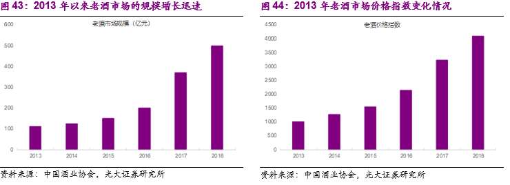 通过品牌营销提升茅台品牌价值:茅台老酒市场的维护为典型代表。除了相对合理的量价政策执行,茅台在品牌营销上也非常注重其品牌价值的维护和强化,最有代表性的便是茅台老酒市场的建立。2009年北京荣宝拍卖公司率先组织中国名优老酒拍卖;2010年北京歌德拍卖公司第一次举办了中国陈年名酒专场拍卖会;2014年中国酒业协会成立了名酒收藏委员会,通过组织对名酒鉴定、收藏、估价、拍卖和出具权威鉴定文件证书等一系列规范和引导措施,引导老酒市场秩序。根据2019年中国酒业协会联合歌德盈香发布的《中国老酒市场指数》报告,2018年国内老酒市场规模已经达到500亿元,老酒的购买人数也从2013年的278万人增加到2018年的1068万人。如果以2013年作为1000点的价格基数,2018年的老酒市场指数已经达到了4080点,以一瓶1991年生产的500ml飞天茅台为例,2013年时其老酒市场价格为3100元/瓶,2018年在老酒市场的价格已经达到21230元/瓶。