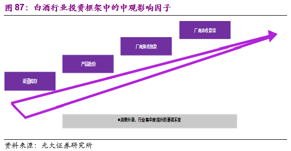 微观层面,不同公司的治理结构不同,白酒企业以国企为主,若有机制上的突破和改善,则有望提高公司的运营效率,自下而上带来持续增长的动力。其次,公司管理层在不同时期采取的包括量价战略在内的经营策略也不尽相同,相同宏观和中观环境下的经营效果也会有所差异;不同香型白酒的生产工艺不同,产能限制等客观因素也会影响公司的战略选择。由于微观层面的因素相对较为复杂,在我们的投资框架中不再详细介绍。