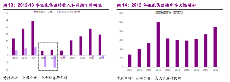 在白酒调整时期经销商层面的反应会更加迅速和明显,以经销白酒为主业的港股上市公司银基集团的财务数据为例,2012-2015年白酒调整期公司利润表中收入体量快速下降并同时出现了大幅的亏损,资产负债表中的库存也出现了快速上升。