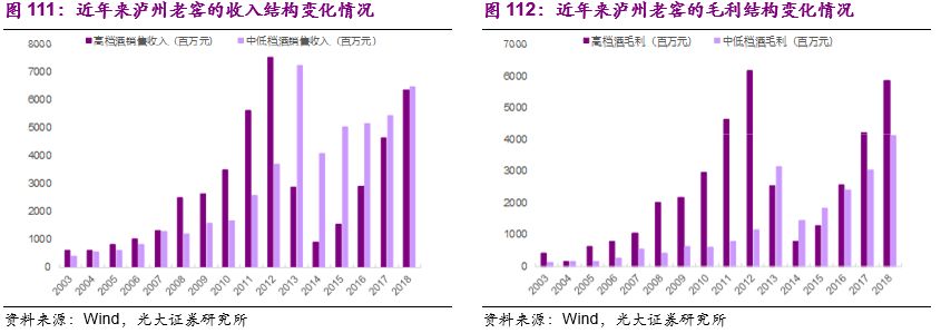 在2012年白酒深度调整之前,高档白酒是最主要的收入和毛利来源,2012年高档白酒的收入和毛利占比分别达到67%和84%。然而在2013-15年的行业调整期国窖1573由于错误的价格战略丢失了大量的市场份额,因此中低档白酒的收入和毛利占比快速提升,2014年高档白酒的收入和毛利占比分别只有18%和35%。2015年之后,高档白酒国窖1573再次成为公司成长的最核心推动力。以2018年年报为例,高档白酒实现销售收入63.78亿元,占酒类业务收入的比重为49.6%;高档白酒实现销售毛利58.58亿元,占酒类业务毛利的比重为58.7%。