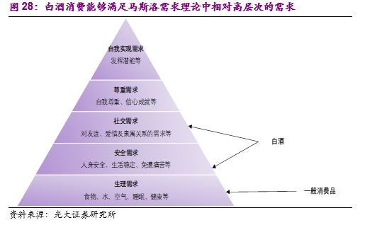 按照经典的需求层次理论,白酒能够满足更高层次的消费需求:按照经济学理论,消费者购买商品时愿意支付的价格取决于商品的边际效用,商品满足消费者的需求层次越高,消费者能接受的产品定价也越高。影响品类定价权的竞争格局、消费粘性以及潜在替代品等,归根到底都是该商品对于消费者的边际效用。对于一般消费品而言,消费者在消费过程中通常满足的只是生理需求,而白酒能够满足社交、安全等更高层次的需求,理应获得更高的产品溢价。