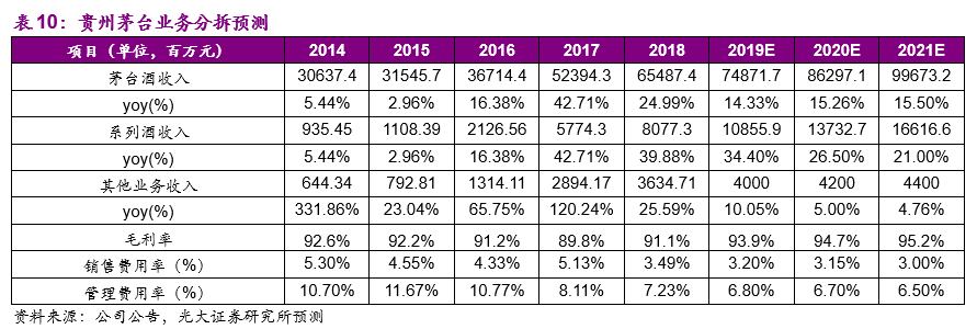 (4)毛利率和费用率,考虑到茅台酒销售均价的提升,我们预测公司2019/2020/2021年综合毛利率分别为93.9%/94.7%/95.2%;费用率方面,我们预测公司2019/2020/2021年销售费用率分别为3.20%/3.15%/3.00%;我们预测公司2019/2020/2021年管理费用率分别为6.80%/6.70%/6.50%。