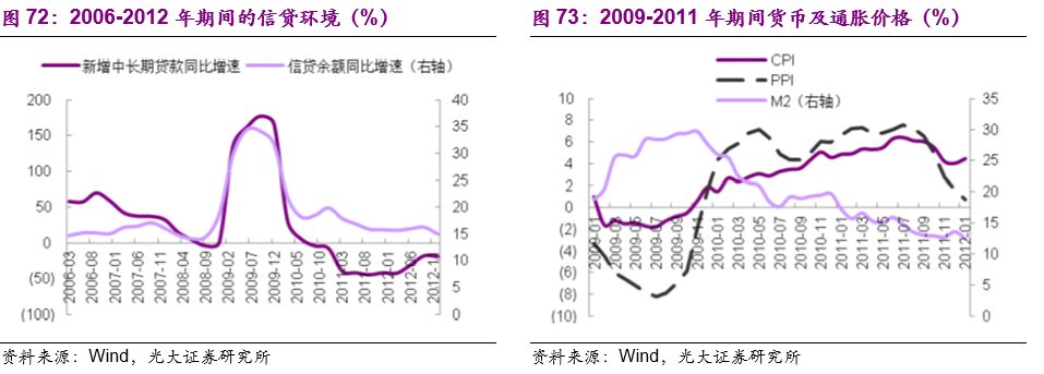 2009-2011年的宏观背景基本特征:信贷快速扩张,工业企业利润增速改善明显。不同的地方则是,通胀压力使得政策紧缩的强度和跨度都比2004-2006年更大。2008年三季度开启的信贷扩张和稍早时候启动的基建投资在2009年见效显著,工业企业利润在2009年迎来爆发式增长。之后受制于不断显现的通胀压力和资产泡沫压力,紧缩的宏观调控政策造成需求开始收缩,工业企业利润增速从2010下半年开始逐步回落直至2011年年末见底。2009-2011年,食品饮料行业成为消费品中利润增长率最为稳定、平均增速最高的行业。
