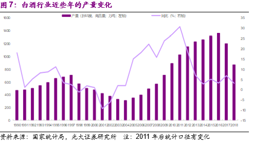 虽然我国的白酒文化历史悠久,但是白酒行业真正市场化运作是从1988年开始,到现在也仅有三十年的时间。按照国家统计局对白酒规模以上生产企业的统计数据,截止到2018年国内白酒产量约为871.2万吨,可比口径下同比小幅增长3.1%,继续保持2013年以来的个位数增长趋势。同时可以发现,国内白酒行业的产量有相对明显的周期波动,分别在1989-1992年、1998-2003年以及2012-2015年出现过三次较为明显的调整。