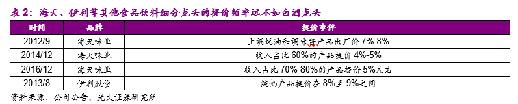 横向对比来看,白酒龙头的直接提价能力远强于其他消费品细分龙头:如果与海天、伊利等其他食品饮料龙头进行横向对比,茅台无论是在提价频率还是每次的提价幅度上都优势明显。不考虑产品结构升级对于产品销售均价的拉升作用,以海天为代表的调味品龙头基本延续每两年一次的提价周期,每次的加权提价幅度都在小个位数左右;而乳业龙头伊利近年来唯一的主力常温白奶产品直接提价发生在2013年,至今已经有5年的时间未进行过直接提价。