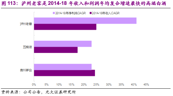 泸州老窖是2014-18年收入和利润年均复合增速最快的高端白酒,未来仍将受益于高端白酒的消费扩容。20014-2018年泸州老窖的收入和净利润年均复合增速分别为25%和41%,均位于高端白酒三大品牌的第一位。在行业调整期结束之后,老窖通过自上而下大刀阔斧的改革顺利实现了“深蹲起跳”:1)人事:董事长刘淼+总经理林峰于2015年上任,不仅年富力强、还均出身于销售一线;2)渠道体系:废除柒泉模式,成立专营公司,相较于柒泉公司的大商模式,专营公司采用深度分销、直控终端的模式;3)产品布局:确认五大单品战略,低端酒大幅度砍掉开发品牌。4)价格策略:2014年国窖1573开始降价,并逐步顺价保证经销商盈利,培养渠道积极性。