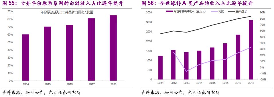 (2)系列酒业务,我们预测公司2019/2020/2021年收入增速分别为34.40%/26.50%/21.00%,其中销量的增长分别为12%/10%/10%,销售吨价的增长分别为20%/15%/10%。