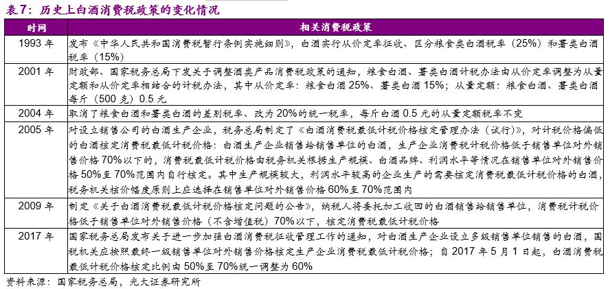 白酒市场化运作之后,其消费税的征收政策也在不断变化和完善,也是不断趋严的过程。变化主要体现在:1)计税方式:从1993年开始白酒消费税实行从价定率征收,并且区分了粮食类白酒和薯类白酒的税率,2001年开始粮食白酒、薯类白酒计税办法由从价定率调整为从量定额和从价定率相结合的计税办法,并一直沿用至今。2)征收税率:1993年粮食白酒、薯类白酒分别采用25%和15%的区分税率征收,2001年计税方式变化之后从价定率的征收比率未变、新增粮食及薯类白酒0.5元/500g的从量定额计税方式。2004年取消了粮食白酒和薯类白酒的差别税率、改为20%的统一税率,每斤白酒0.5元的从量定额税率不变。3)征收环节:2005年开始,对设立销售公司的白酒生产企业核定消费税最低计税价格,2009年和2017年分别对委托加工收回的白酒销售给销售单位及设立多级销售单位的行为核定最低计税价格。