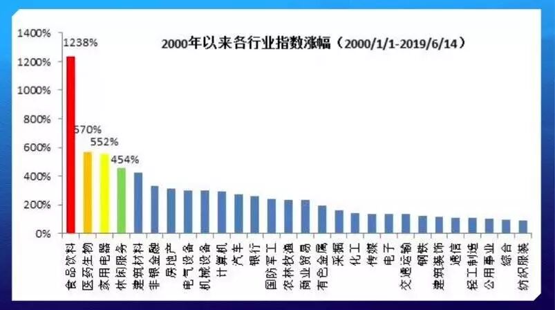 酒类行业首先是一个好行业。这里有张图,图上有2000年到2019年6月14号的各行业指数。有句俗语,“男怕入错行,女怕嫁错郎”,什么是好行业?挣钱的行业才是好行业。一个有定价权的行业才是好行业,一个能涨价的行业才是好行业。