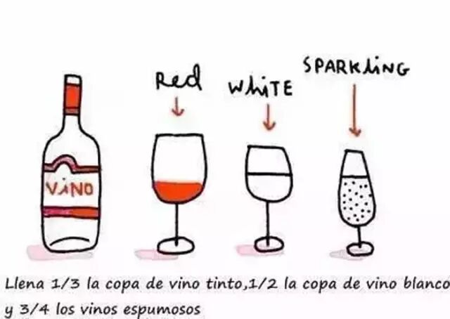 红酒倒满1/3,白酒倒满1/2,香槟倒满3/4