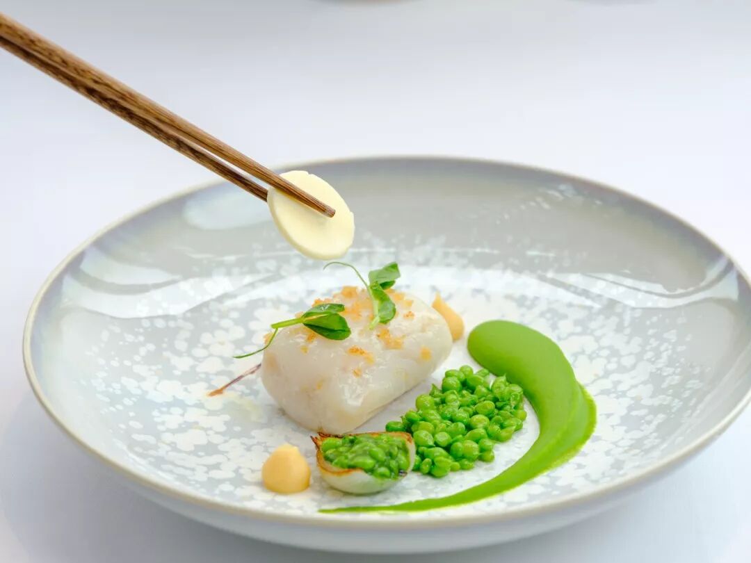 上海店菜式:线钓黄鳕鱼 | 慢煮调味 | 榛子油雪葩 | 法国洋葱与青豆 | 法式青豆汤