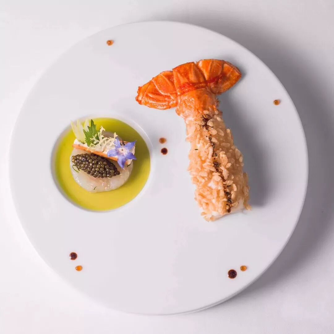 上海店菜式:腌制脆皮鳌虾 | 芹菜根绿苹果 | 鱼子酱 | 法国芥末奶油