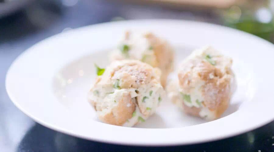 最好选已经变硬的法棒,切成小块,加点香菜,倒入250毫升温牛奶,然后撒一勺盐,打个蛋进去,再加点面粉,撒一些黑胡椒,搅拌均匀,最后揉成高尔夫球大小的形状,放入锅里用黄油煎,直到丸子表皮变成棕色。取出,待用。