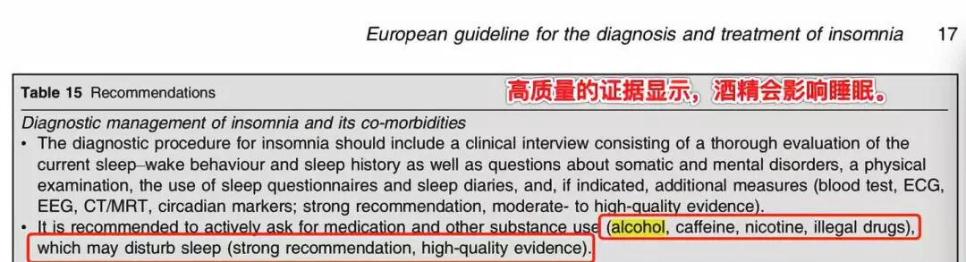 中华医学会神经病学分会发布的《中国成人失眠诊断与治疗指南(2017 版)》、欧洲睡眠研究学会发布的《2017 ESRS欧洲指南:失眠症的诊断和治疗》建议,睡前不要饮酒。