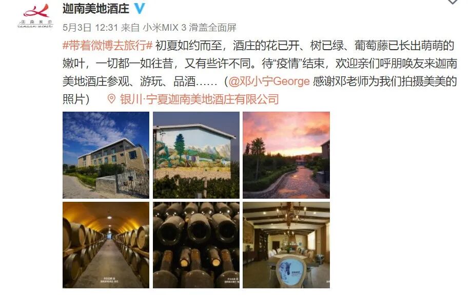 “初夏如约而至,酒庄的花已开、树已绿、葡萄藤已长出萌萌的嫩叶,一切都一如往昔,又有些许不同。待‘疫情’结束,欢迎来迦南美地酒庄参观、游玩、品酒……”5月初,迦南美地酒庄在官方社交账号上发了这样一段话。