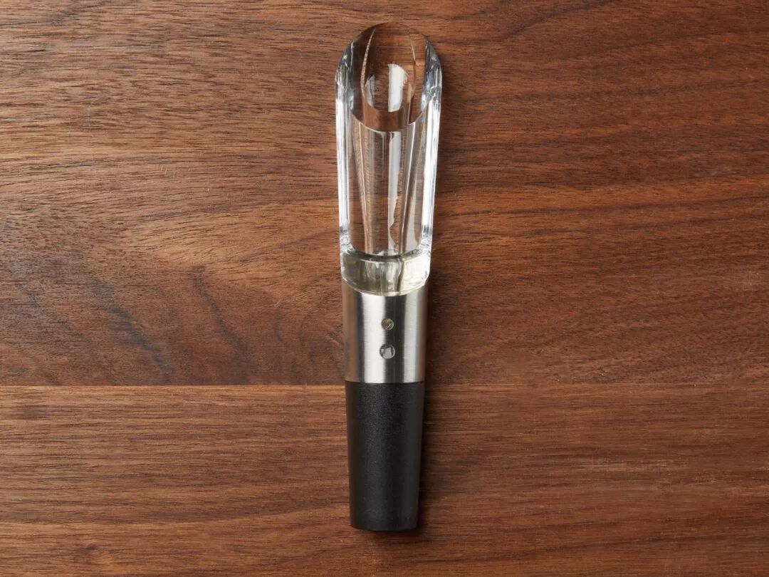 这款醒酒器,设计精巧,装在瓶口,既可以倒酒,又可以醒酒。