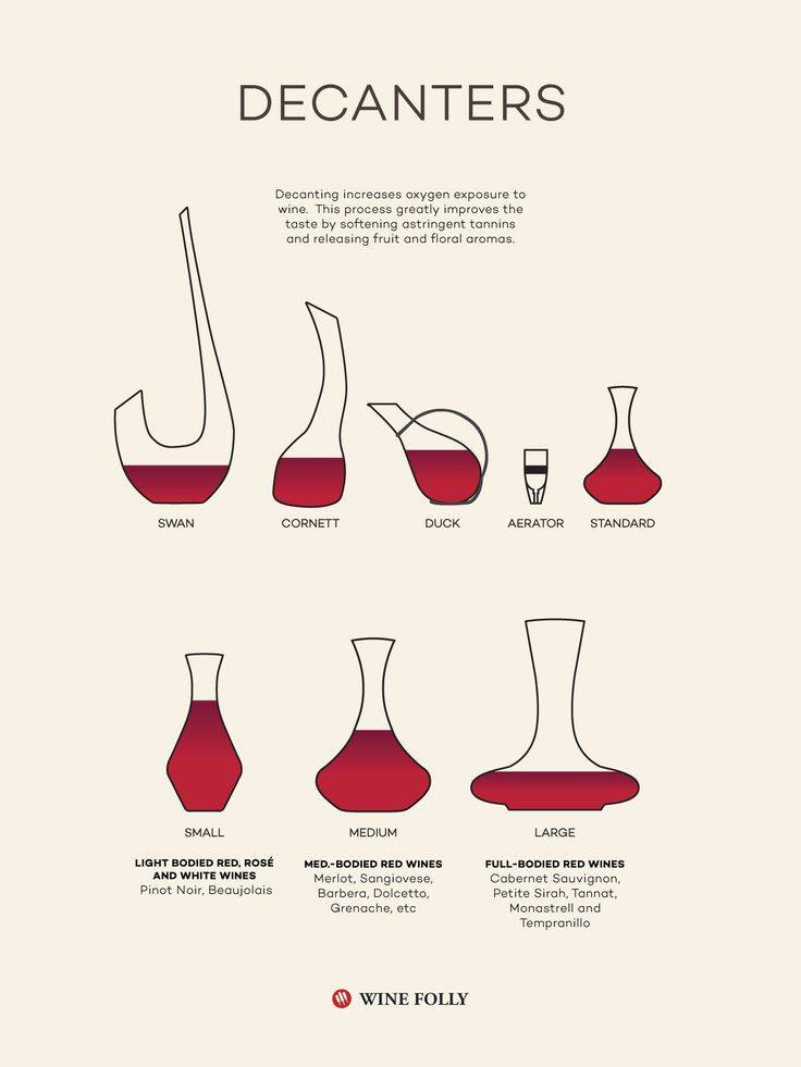 但如果可以拥有一款又好看又实用的醒酒器,何乐而不为呢?而且不同形状的醒酒器其实也有对应的适合醒的酒。下图展示了几款常见醒酒器的样式,也根据醒酒器的肚子大小提供了使用建议,总结一下,就是: