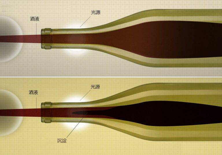 如果需要给老酒去除沉淀,需要提前一两天把酒瓶竖直放置,让沉淀物沉在瓶底。为了能在倒酒时看清沉淀物什么时候开始出现,需要有一个光源(比如蜡烛或者手电筒)放在桌上,倒酒时把瓶子放在光源上方,观察酒脖子,一旦沉淀流近酒脖子,立刻停止倒酒,防止倒出沉渣,如下图所示。