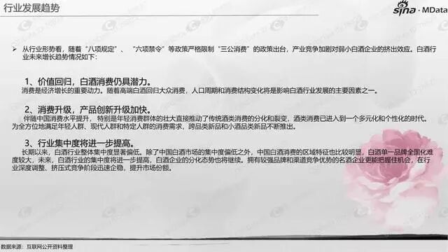 从行业形势看,随着“八项规定”、“六项禁令”等政策严格限制“三公消费”的政策出台,产业竞争加剧对弱小白酒企业的挤出效应。白酒行业未来增长趋势情况如下: