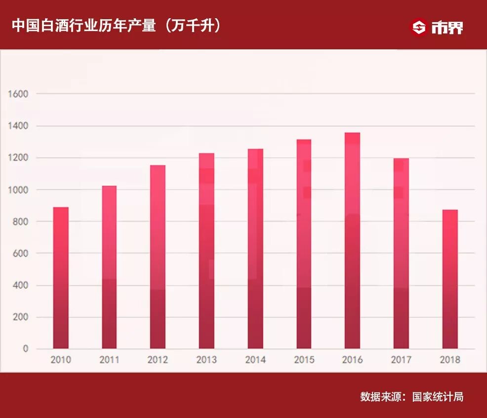 统计数据显示,近两年,我国白酒行业总产量已经从2016年的1358.4万千升,下降到了2018年的871.2万千升,2018年同比大降27.3%。