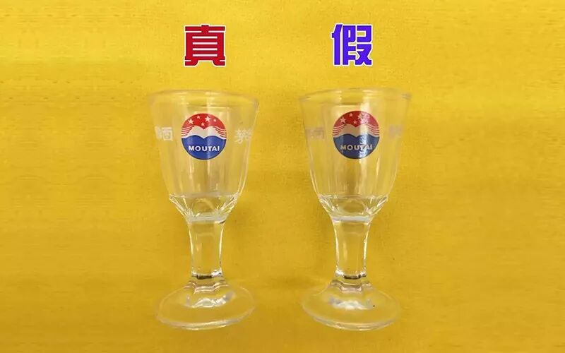 假茅台: 酒杯玻璃材质低劣,酒杯整体暗哑光泽度较低(需对比)。