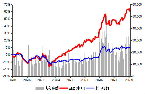 虽然白酒板块的业绩指标出现了集体性下滑,但似乎并不影响投资者对白酒股的投资热情。白酒板块在2020年4月份之前和上证综指的走势高度一致,而在4月份之后走出了一波独立行情,上半年白酒板块上涨高达25.7%,而同期上证综指下跌3.26%。截至2020年9月8日,白酒板块今年以来累计上涨52.97%。不过,在8月31日半年报截止日期后,白酒板块出现了些许回调。